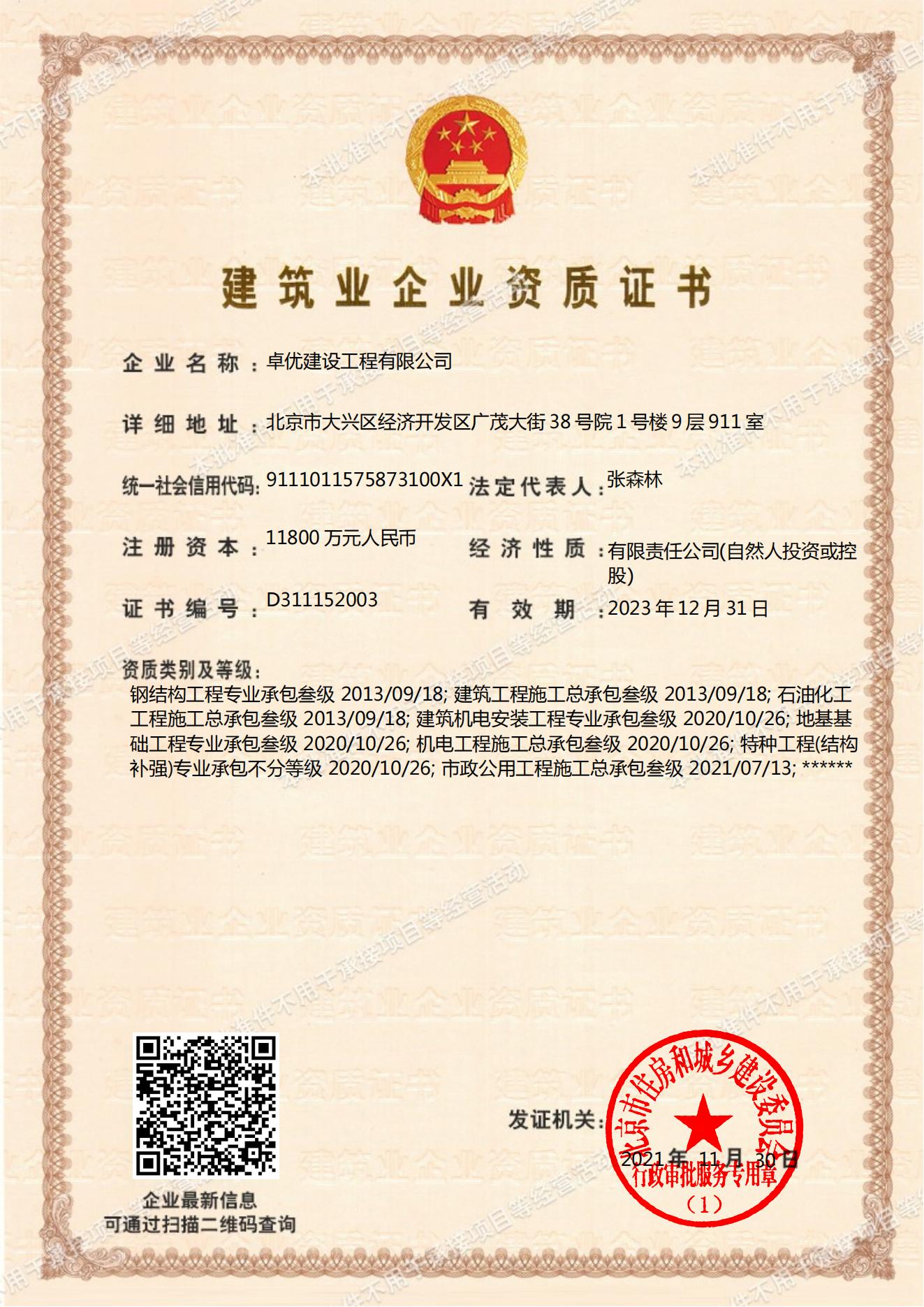 北京卓优建设集团有限公司,注册资金 1.88 亿元,集团资质: