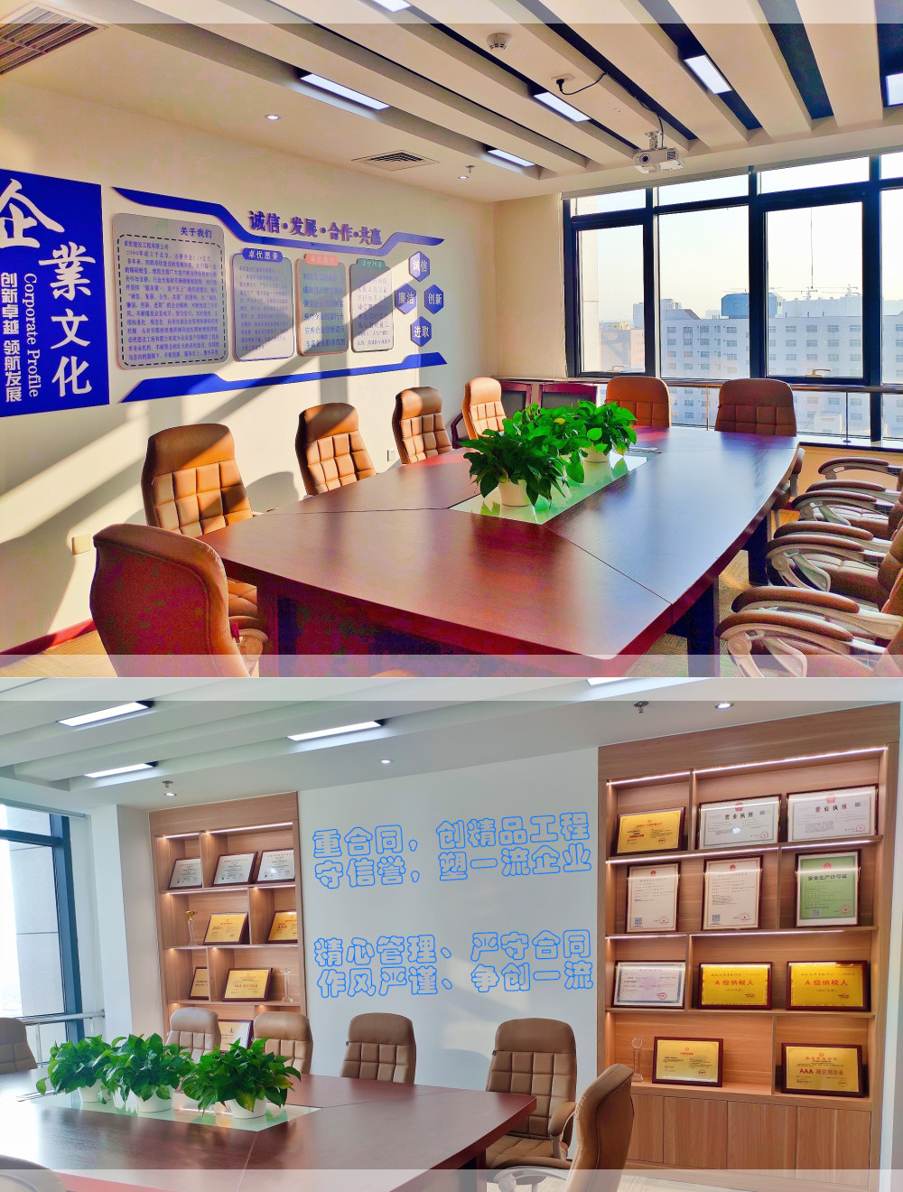 收拾的很整洁的会议室,摆放整齐的荣誉照片,阳光透过窗户洒下来,整个屋子显得富有朝气。